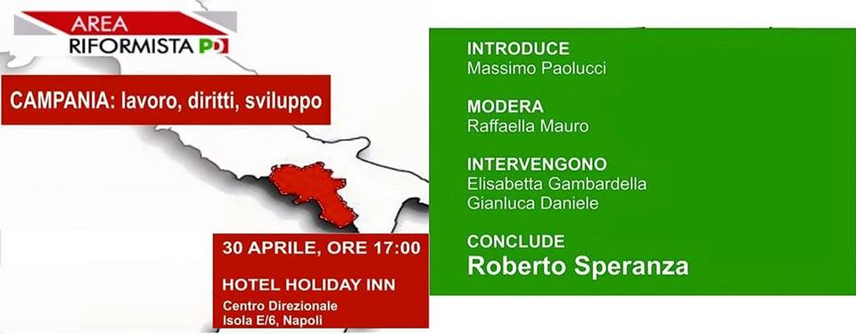 Domani, giovedì 30 aprile, alle ore 17, nei pressi dell’Hotel Holiday Inn sito al Centro Direzionale di Napoli isola E\6,si terrà l’incontro promosso dall’Area Riformista del PD con la partecipazione dell’on. Massimo Paolucci, dei candidati al consiglio regionale della Campania Raffaella Mauro, Elisabetta Gambardella, Gianluca Daniele. A concludere i lavori ci sarà l’on. Roberto Speranza, già capogruppo PD alla Camera dei Deputati.