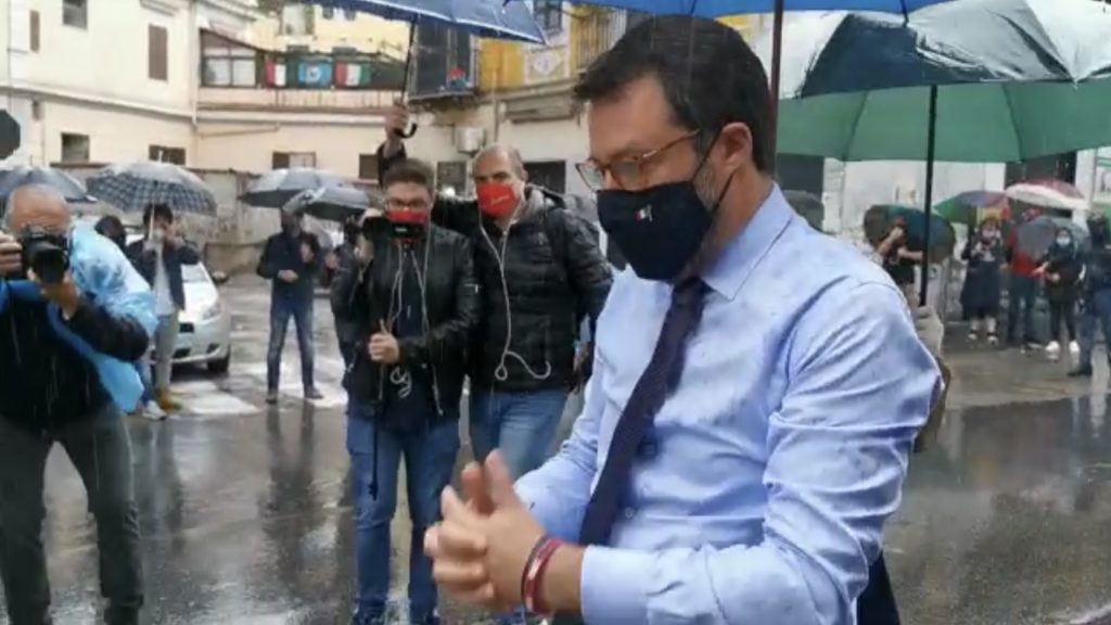 A Napoli, sotto una pioggia battente, il leader della Lega, Matteo Salvini, ha deposto un fascio di fiori sul luogo in cui ha perso la vita il poliziotto Pasquale Apicella. L’agente morì il 27 aprile scorso in un incidente stradale mentre inseguiva una banda di rapinatori in calata Capodichino. E proprio sullo spartitrafffico dove già erano stati deposti fiori e lumini, l’ex ministro dell’Interno ha voluto portare il suo omaggio. Poche le persone ad accoglierlo molti, invece, gli esponenti del partito che l’hanno accompagnato a bordo di alcune auto.