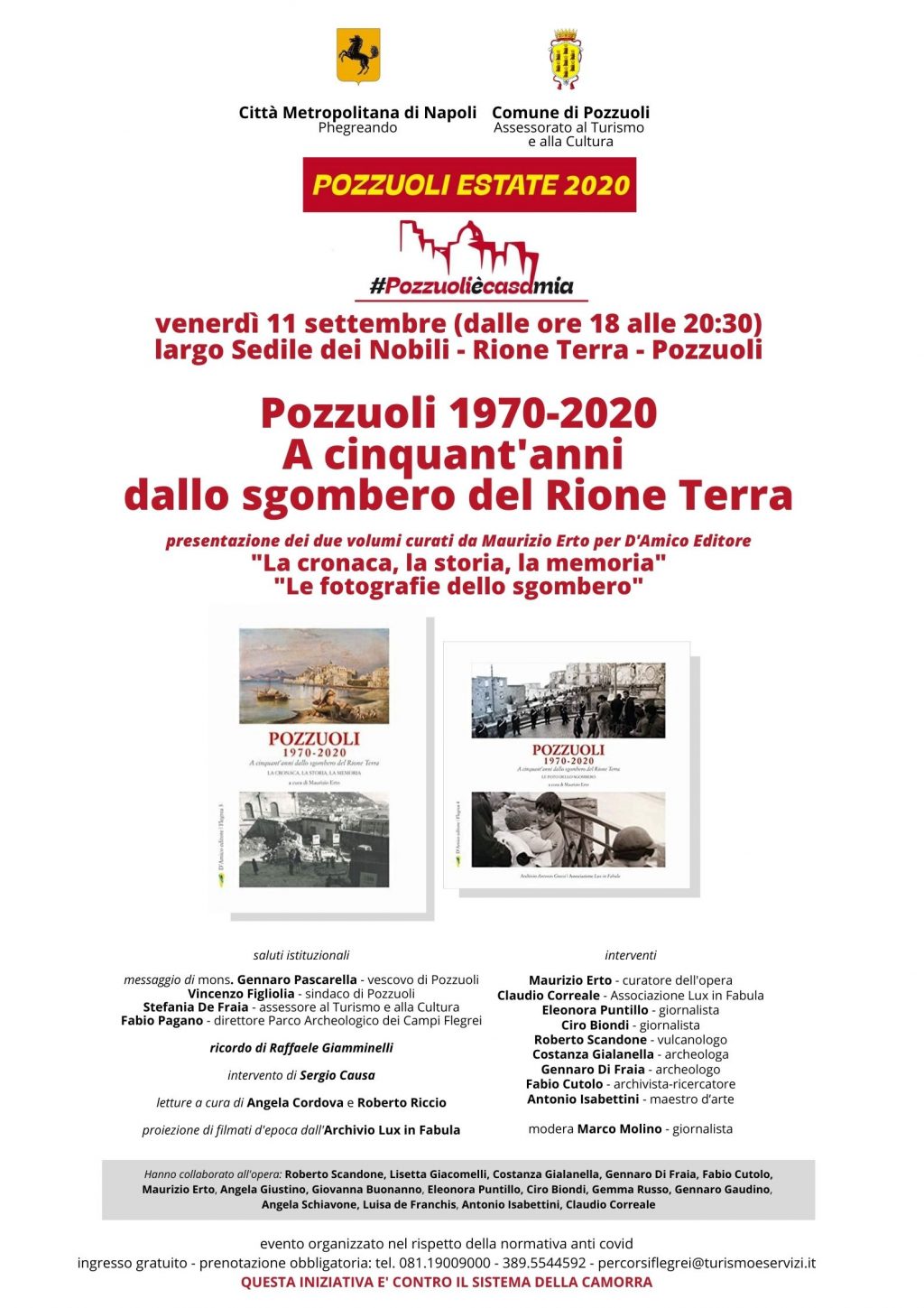 Nell’ambito del Programma di eventi “Pozzuoli Estate 2020” promosso dal Comune di Pozzuoli, si terrà venerdì 11 settembre alle ore 18 al Rione Terra la presentazione dell’opera in 2 volumi Pozzuoli 1970-2020. A cinquant’anni dallo sgombero del Rione Terra, editi dall’Editore D’Amico per la Collana Flegrea diretta da Maurizio Erto. Con questa iniziativa, organizzata per lo scorso febbraio ma poi rinviata a causa della epidemia di Covid-19, i 15 autori dell’opera hanno voluto offrire un loro contribuito per mantenere viva la memoria dello sgombero del marzo 1970 e riaprire il confronto sul futuro del Rione Terra.