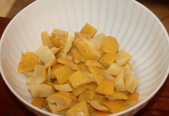 Lavate bene e sbucciate i cedri (eliminando testa e piede del frutto) anche in maniera grossolana, mettendo da parte le bucce ( fig 1 ).