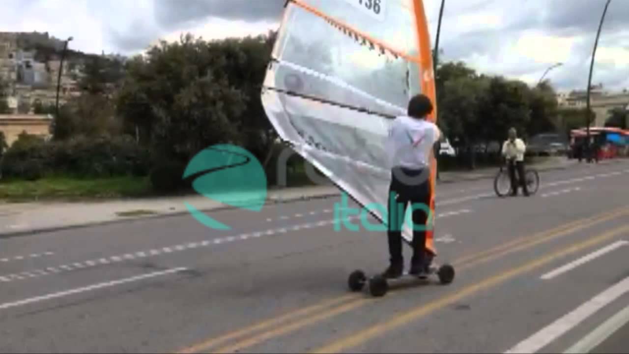 Chi si è trovato a passare questa mattina sul lungomare di Napoli ha probabilmente assistito a questo singolare spettacolo: sfruttando il vento proveniente dal mare, un ragazzo si è cimentato in una “regata” di windsurf sull’asfalto di via Caracciolo, scivolando sulle ruote invece che sulle onde. Il lungomare Caracciolo diventa ancora una volta protagonista dei “colpi di genio” dei napoletani: dopo la performance del surfista urbano che, agganciato a un’automobile, surfava in una pozzanghera dopo le abbondanti piogge dello scorso aprile, oggi è il turno del velista, che si cimenta in una prova altrettanto suggestiva. Una trovata geniale, quella del windsurf a rotelle, che potrebbe permettere anche a chi non abita vicino al mare di allenarsi nel proprio sport preferito.