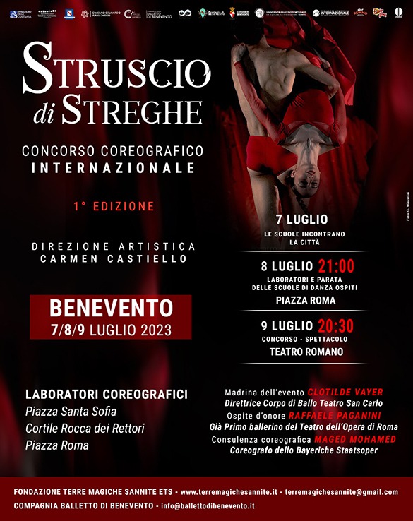 Ed in questo contesto si evince ancor di più la necessità di legare le streghe al Balletto di Benevento, fondato e diretto da Carmen Castiello nel 2012. In questi unidici anni l’ensemble sannita si è distinto più volte al “Festival Benevento Città Spettacolo” con la performance “Racconti mediterranei”, che ha raccolto un grande successo di pubblico e di critica. Da lì le stagioni successive con “Bolero” al Teatro Carlo Gesualdo di Avellino, “Lo Schiaccianoci” al Teatro Massimo, “Carmen” con Josè Perez ed Odette Marucci al Teatro Romano di Benevento, “Voci di Donne” e “Romeo e Giulietta” ancora al Teatro Romano, “West Side Story”, “Omaggio a Fellini – La Strada e i suoi Ricordi Carla Fracci e Giancarlo Giannini si raccontano…” con la partecipazione straordinaria di Carla Fracci, Giancarlo Giannini e Beppe Menegatti al Teatro Romano di Benevento. Undici anni di successi che cercano la conferma con lo Struscio di Streghe, proprio dove la magia nel territorio ha lasciato tracce fin dall’epoca romana in cui era molto diffuso il culto di Iside, definita “Signora di Benevento”.