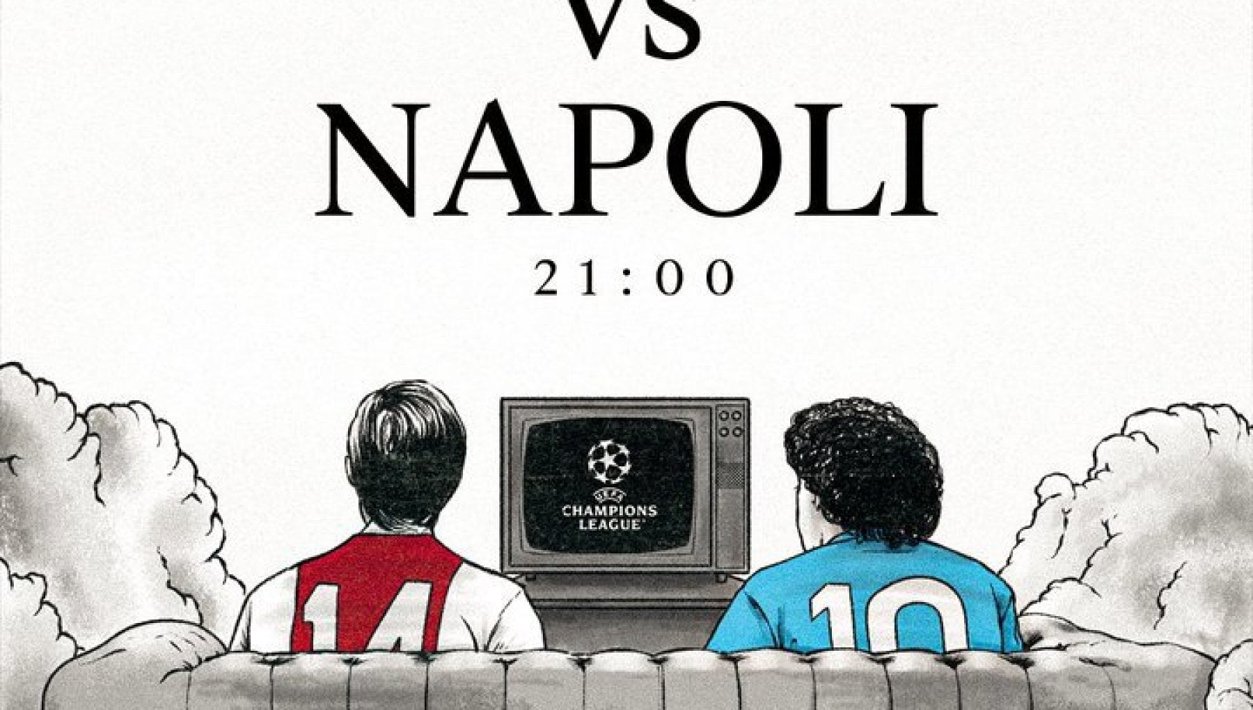 La società olandese ha voluto omaggiare i due campioni con una vignetta che ritrae Cruijff e Maradona davanti a una tv, sul divano tra le nuvole, in attesa del match Ajax-Napoli.