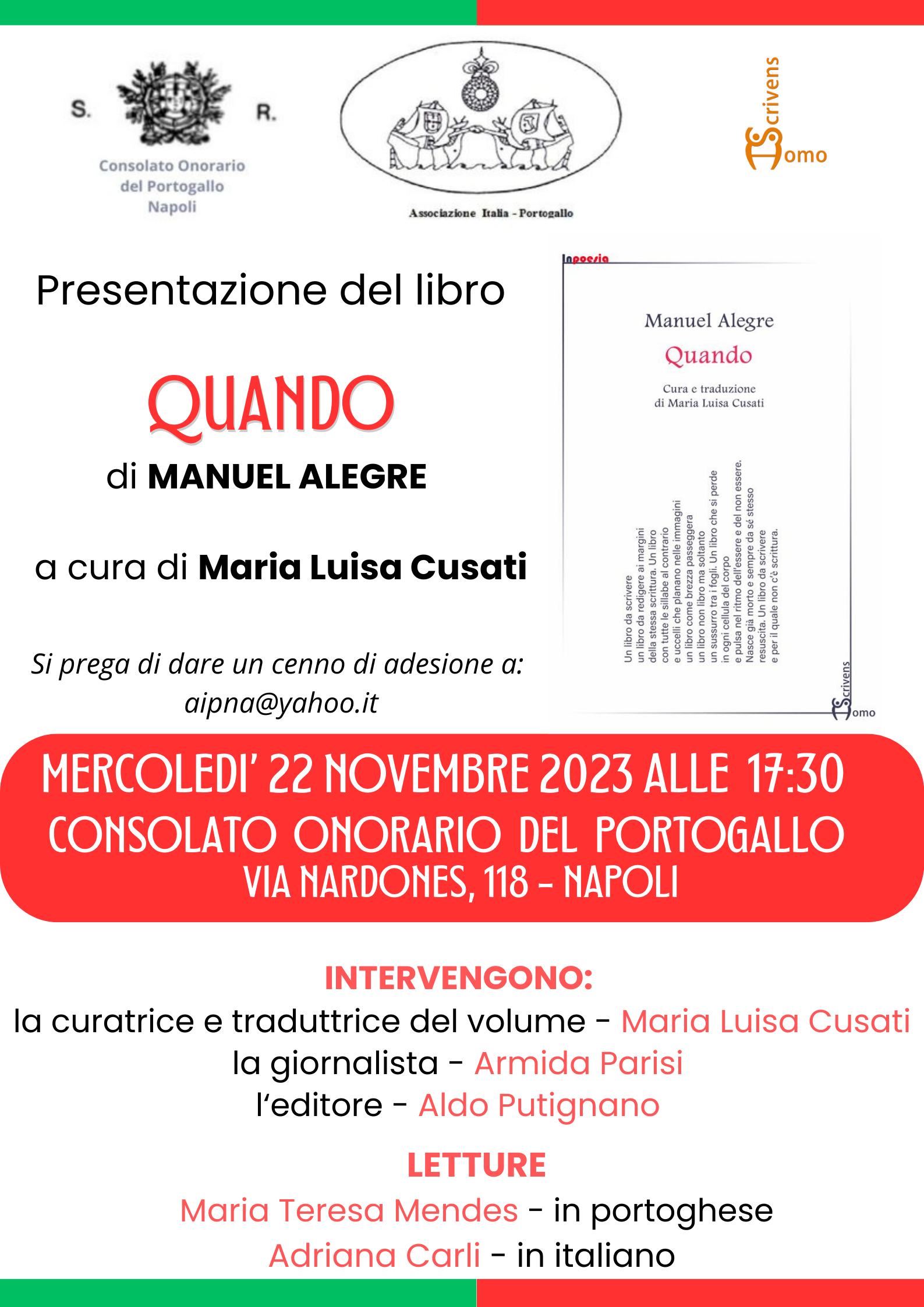 Il volume Quando, edito da Homo Scrivens, è stato curato e tradotto in italiano dall’esperta lusitanista Maria Luisa Cusati – Professore di Letteratura Portoghese e Brasiliana all’Università “L’Orientale” e all’Università “Suor Orsola Benincasa” e Console Onorario del Portogallo a Napoli.