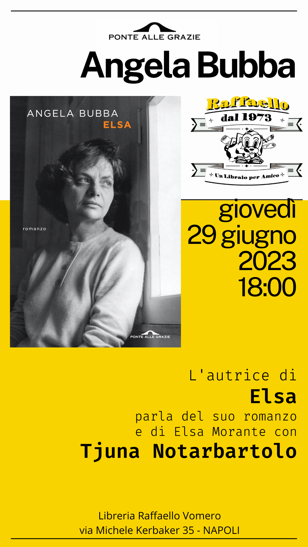Giovedì 29 giugno, alle ore 18, Angela Bubba presenta “Elsa” (Ponte alle Grazie) a Napoli, alla libreria Raffaello, Via Michele Kerbaker 35, Napoli, al Vomero. Dialoga con l’autrice Tjuna Notarbartolo.