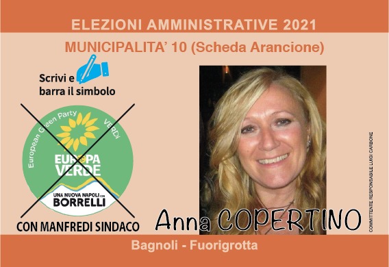 “Chi mi conosce, nel bene e nel male, ha ben chiaro chi sono. Ovviamente non posseggo bacchette magiche, né prevedo il futuro, ma se dovessi farcela nella candidatura, continuerò a fare non solo ciò che già faccio, ma anche tanto altro”. Così Anna Copertino, scrittrice, giornalista, napoletana, da anni impegnata sul territorio, candidata alla X Municipalità alle prossime elezioni amministrative a Napoli con Europa Verde.