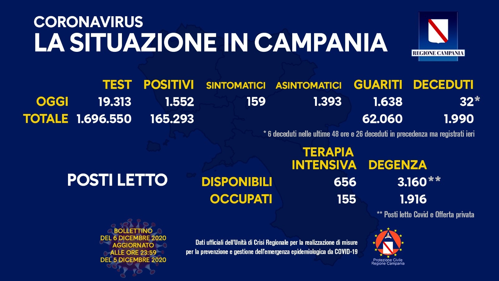 Nel bollettino giornaliero sulla pandemia da Coronavirus i guariti superano i positivi. La Regione Campania ha fatto registrare nella giornata di oggi 6 dicembre 1552 i nuovi casi di positività al Covid-19, a fronte di 19313 tamponi analizzati. I guariti sono invece 1638.