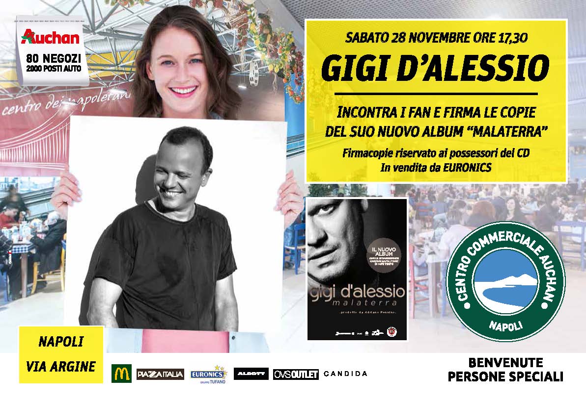 Tra le diverse tappe, il 28 novembre Gigi D’Alessio sarà al Centro Commerciale Auchan Napoli per firmare le copie del suo ultimo lavoro e incontrare i fan. Il firma copie è riservato solo ai possessori del cd “Malaterra”, acquistabile anche nel negozio Euronics presente all’interno del Centro.