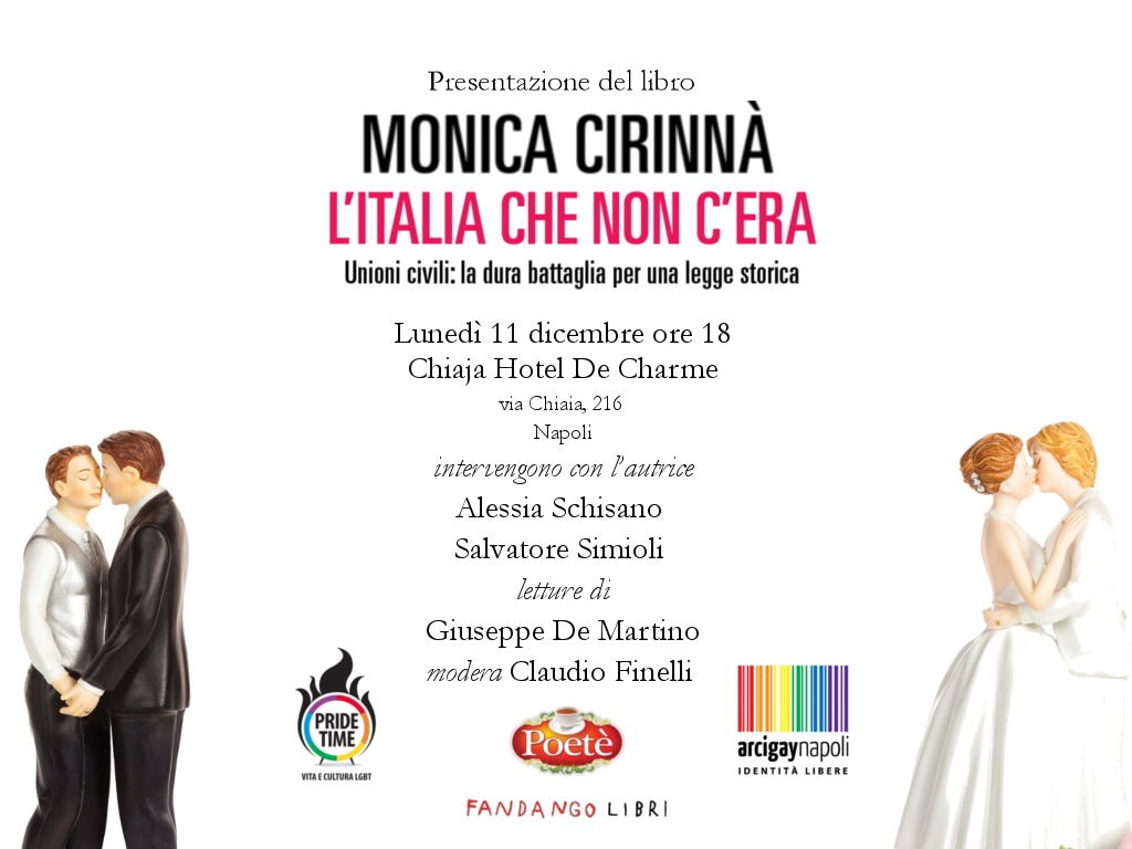 Oggi lunedì 11 dicembre, ore 18, presso il Chiaja Hotel de Charme, via Chiaia 216 – Napoli, per lo speciale Poete’ Unioni Civili, presentazione L’Italia che non c’era di Monica Cirinnà (Fandango). Interverranno con l’autrice Salvatore Simioli e Alessia Schisano. Letture di Giuseppe De Martino. Modera Claudio Finelli.