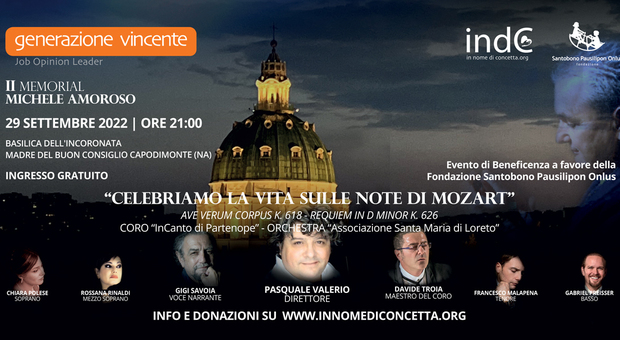 “Celebriamo la vita sulle note di Mozart” è il titolo del concerto che si svolgerà il 29 settembre dalle 21 nella basilica dell’Incoronata Madre del Buon Consiglio a Napoli, sulla collina di Capodimonte. Si tratta del II memorial Michele Amoroso, a sostegno di attività per i malati oncologici e i loro familiari.