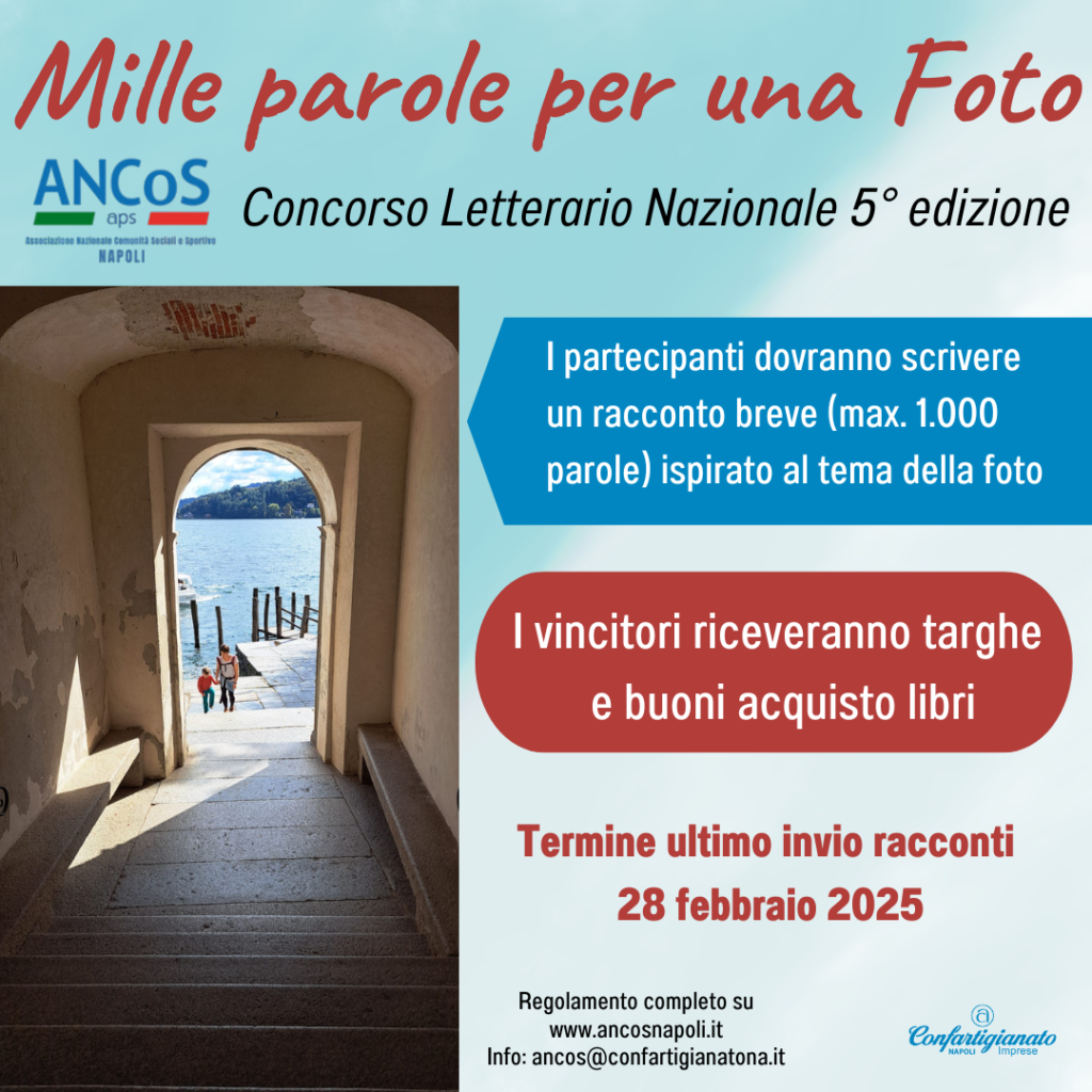 ANCoS APS Napoli, con il patrocinio di Confartigianato Napoli, istituisce il concorso di scrittura per racconti brevi (massimo mille parole) ispirati alla foto pubblicata dal titolo “Mille parole per una foto”. Il concorso giunto alla sua 5° edizione si inserisce nel progetto PAIDEIA: ANCoS Aps Napoli per i giovani e i diversamente giovani.