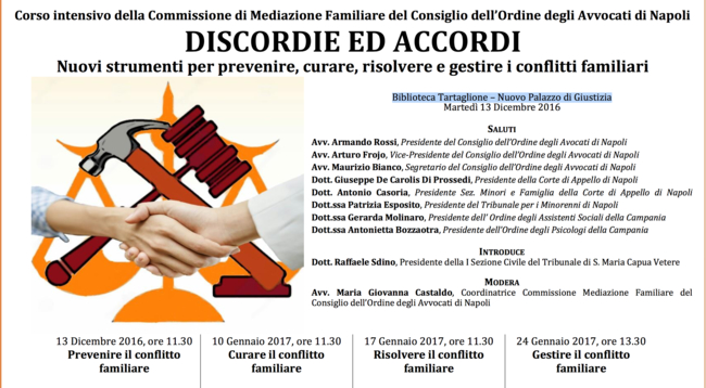 Corso intensivo della Commissione di Mediazione Familiare del Consiglio dell’Ordine degli Avvocati di Napoli: ‘DISCORDIE ED ACCORDI‘, nuovi strumenti per prevenire, curare, risolvere e gestire i conflitti familiari.
