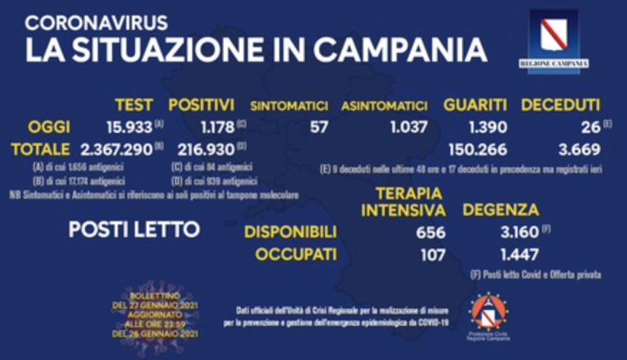 Sono 1.178 i nuovi casi di Covid in Campania, di cui 57 sintomatici, su 15.933 tamponi eseguiti: il tasso di positività scende dunque al 7,39 %, in netto miglioramento rispetto all’8,53 di ieri. Le nuove vittime segnalate dal bollettino dell’unità di crisi sono 26, di cui 9 decedute nelle ultime 48 ore e 17 risalenti ai giorni precedenti; 1.390 i guariti.