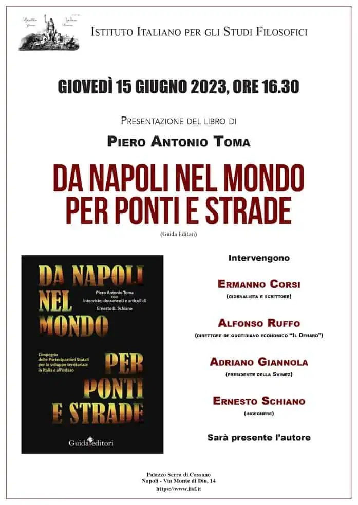 Sarà presentato giovedi 15 giugno 2023 alle ore 16.30 al Palazzo Serra di Cassano a Napoli, sede dell’Istituto di Studi Filosofici, in Via Monte di Dio 14,il libro “Da Napoli nel Mondo per Ponti e Strade” del giornalista e scrittore Piero Antonio Toma, realizzato comenarrazione, intervista all’ingegnere Ernesto B. Schianoe pubblicato da Guida Editori. Interverranno nel corso del pomeriggio culturale oltre all’autore, Ermanno Corsi, giornalista e scrittore, Alfonso Ruffo, direttore del quotidiano economico “il Denaro”, Adriano Giannola, Presidente dellaSvimez e l’ingegnere Ernesto B. Schiano.