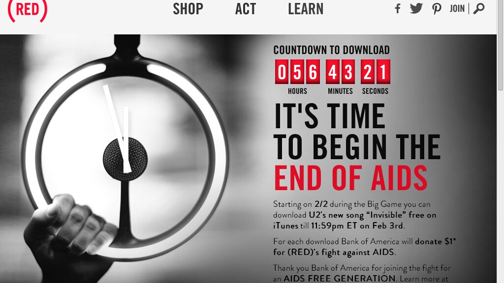 Il prossimo 2 febbraio, la tanto attesa domenica del Super Bowl, i Seattle Seahawks e i Denver Broncos non saranno i soli a scendere in campo. (RED) e Bank of America, infatti, utilizzeranno il lancio della canzone per ufficializzare la loro collaborazione nella lotta contro l’AIDS. Per ogni download di “Invisible”, Bank of America donerà 1 dollaro a (RED) fino ad un totale di 2 milioni di dollari, che saranno devoluti al Fondo Globale per la lotta all’AIDS, la tubercolosi e la malaria.