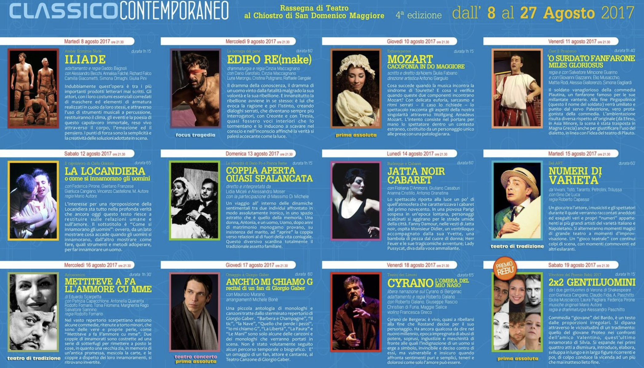 Dal 8 al 27 agosto ritorna Classico Contemporaneo (V edizione), la rassegna organizzata dal teatro dell’Osso che ha luogo per il quinto anno consecutivo nel Chiostro di San Domenico Maggiore a Napoli, nell’ambito della manifestazione ESTATE A NAPOLI a cura dell’Assessorato alla Cultura e al Turismo del Comune di Napoli.