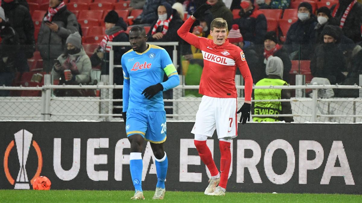Lo Spartak Mosca ha battuto il Napoli 2-1 in un incontro della fase a gironi di Europa League (gruppo C) giocato a Mosca, sotto una leggera nevicata. Doppietta di Sobolev per la formazione russa nel primo tempo, con i padroni di casa in vantaggio già al terzo minuto grazie ad un rigore fischiato per un fallo di Lobotka su Promes.