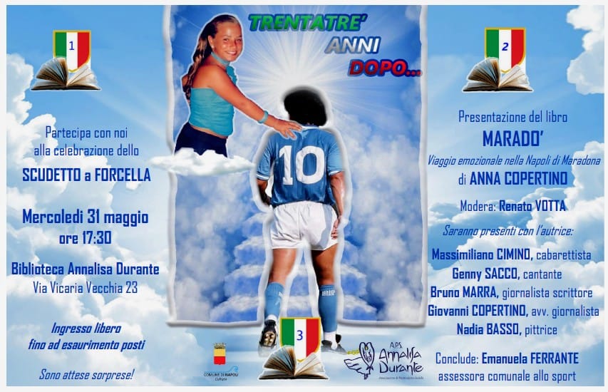 Anna Copertino presenta alla Biblioteca Annalisa Durante il suo libro “Maradò. Viaggio emozionale nella Napoli di Maradona”, dedicando l’evento ad Annalisa, in occasione dei festeggiamenti del terzo scudetto napoletano nel quartiere di Forcella.