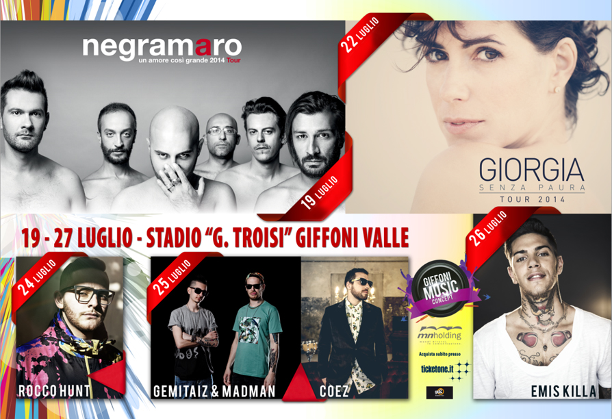 In occasione della 44esima edizione del Giffoni Experience, torna il Giffoni Music Concept, festival musicale in programma dal 19 al 27 luglio a Giffoni Valle Piana (SA). Il festival vedrà l’esibizione allo Stadio Giuseppe Troisi del meglio della musica rap, rock, pop e dance del panorama musicale italiano. Il 19 luglio salirà sul palco la rockband del momento: i Negramaro che inaugureranno il festival con la primissima tappa al sud del loro nuovo ‘Un amore così grande 2014 Tour’.