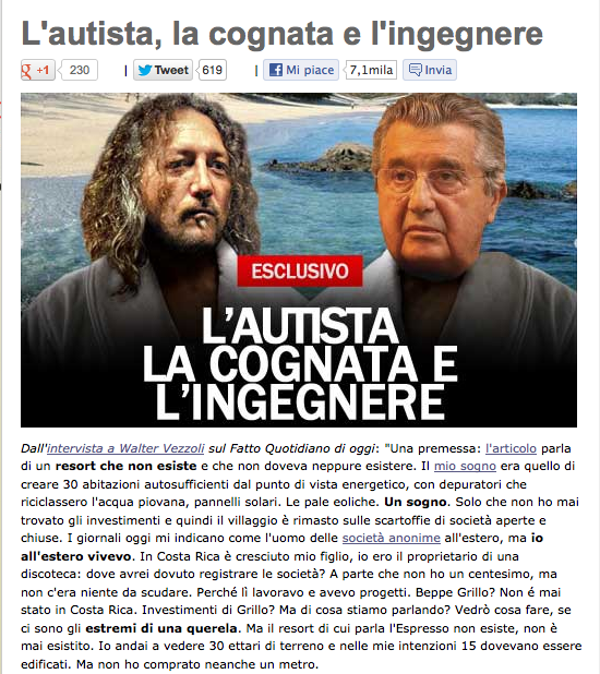 Il blog di Grillo riporta l’intervista di Walter Vezzoli al Fatto Quotidiano che smentisce l’Espresso