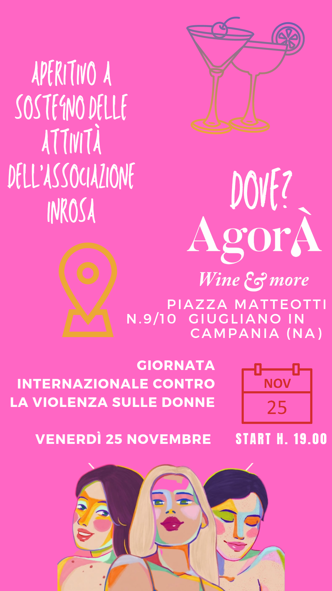 Venerdì 25 novembre, alle 19.00, in occasione della Giornata Internazionale per l’eliminazione della violenza contro le donne, l’Associazione INROSA ha organizzato a Giugliano in Campania (Na), presso Agorà Wine & more, un aperitivo di beneficenza in sostegno delle proprie attività di prevenzione, sensibilizzazione, comunicazione e dei progetti antiviolenza in sostegno delle Donne vittime di abusi.