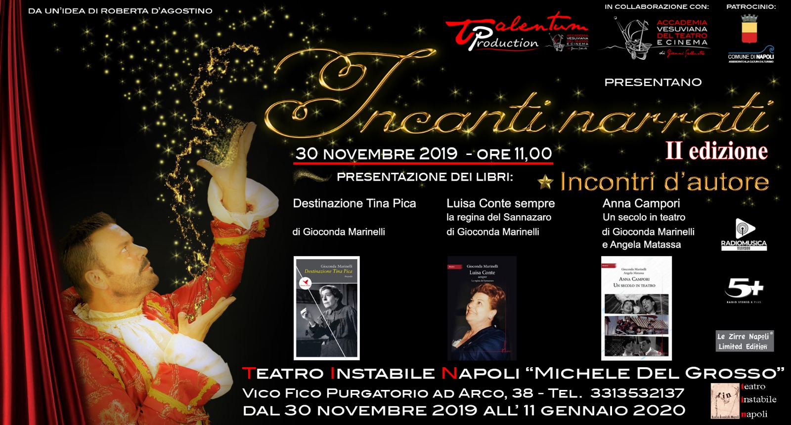 Prende il via il 30 novembre al Tin (Teatro Instabile Napoli) “Michele Del Grosso” la seconda edizione di “ Incanti narrati ” rassegna ideata da Gianni Sallustro e Roberta D’Agostino e prodotta dalla Talentum Production di Marcello Radano e dall’Accademia Vesuviana del Teatro e Cinema: “quattordici appuntamenti tra spettacoli, cinema e presentazioni di libri – dicono gli organizzatori – per animare il Tin il teatro di Michele Del Grosso che per primo intuì le potenzialità artistiche del vico Fico Purgatorio ad Arco a tal punto da essersi battuto per farlo diventare vicolo d’arte. Come già nella scorsa edizione è stato ideato un cartellone eterogeneo ed ampio, con ingresso gratuito per molte delle serate previste, per continuare a far parlare di uno dei luoghi più suggestivi del centro antico”.