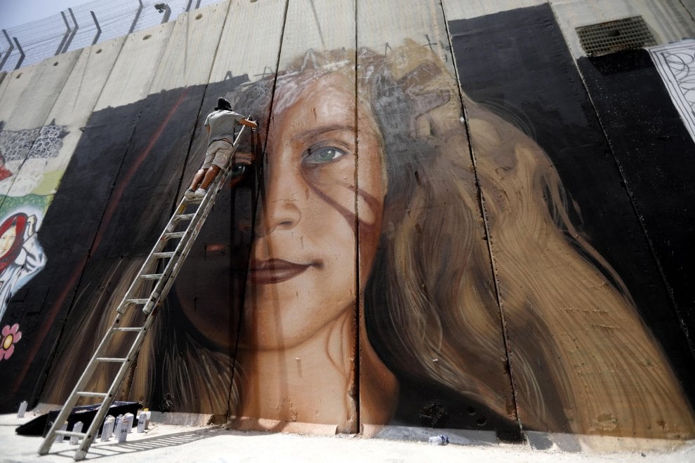 Sul muro che separa Israele dalla Cisgiordania, un ritratto di 7 metri realizzato con brillanti colori spray rappresenta Ahed Tamimi, l’adolescente attivista palestinese, simbolo della lotta anti-israeliana, arrestata per aver schiaffeggiato dei soldati israeliani.