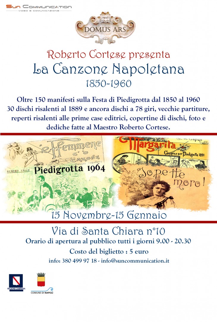 Venerdi 13 novembre, presso la sede del Domus Ars Centro di Cultura in Via Santa Chiara 10 a Napoli si terrà la conferenza stampa per la mostra – evento “La Canzone Napoletana 1850-1960“. Durante la mostra, che si protrarrà sino al 15 gennaio 2016, (tutti i giorni dalle 9 alle 20), sarà esposta una parte della straordinaria collezione di cimeli storici sulla Canzone Napoletana che copre un arco di tempo di oltre un secolo. Il proprietario dei cimeli Roberto Cortese afferma: “…la mia non è una collezione bensì una storia d’amore nata tanti anni fa…“. Del materiale esposto fanno parte: oltre 150 manifesti sulla Festa di Piedigrotta dal 1850 al 1960, 30 dischi risalenti al 1889 e ancora dischi a 78 giri, vecchie partiture, reperti risalenti alle prime case editrici, copertine di dischi, foto e dediche fatte al Maestro Roberto Cortese. Inoltre macchiette, brani tratti da operette , sceneggiate varie e avanspettacolo, raccolte di Guglielmo Cottrau, 150 cartoline illustrate parlanti. Tutte le Piedigrotte avvenute a Napoli dal 1800 in poi e altri 78 giri di Enrico Caruso.