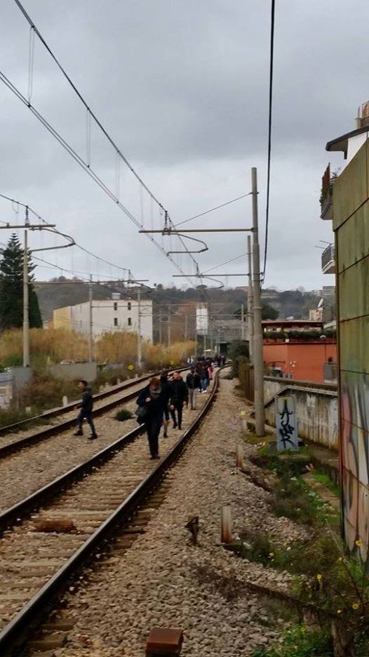 Sembra la scena di un film, ma è pura realtà. Una sorte di esodo quasi rassegnato. Le persone che vedete sono appena scese da un treno della Cumana, che rischiava di prendere fuoco, e tentano di raggiungere la stazione successiva a piedi e con condizioni meteo avverse. Scene che neanche nel terzo mondo dovrebbero vedersi, ma che purtroppo a Napoli e provincia sono pane quotidiano.