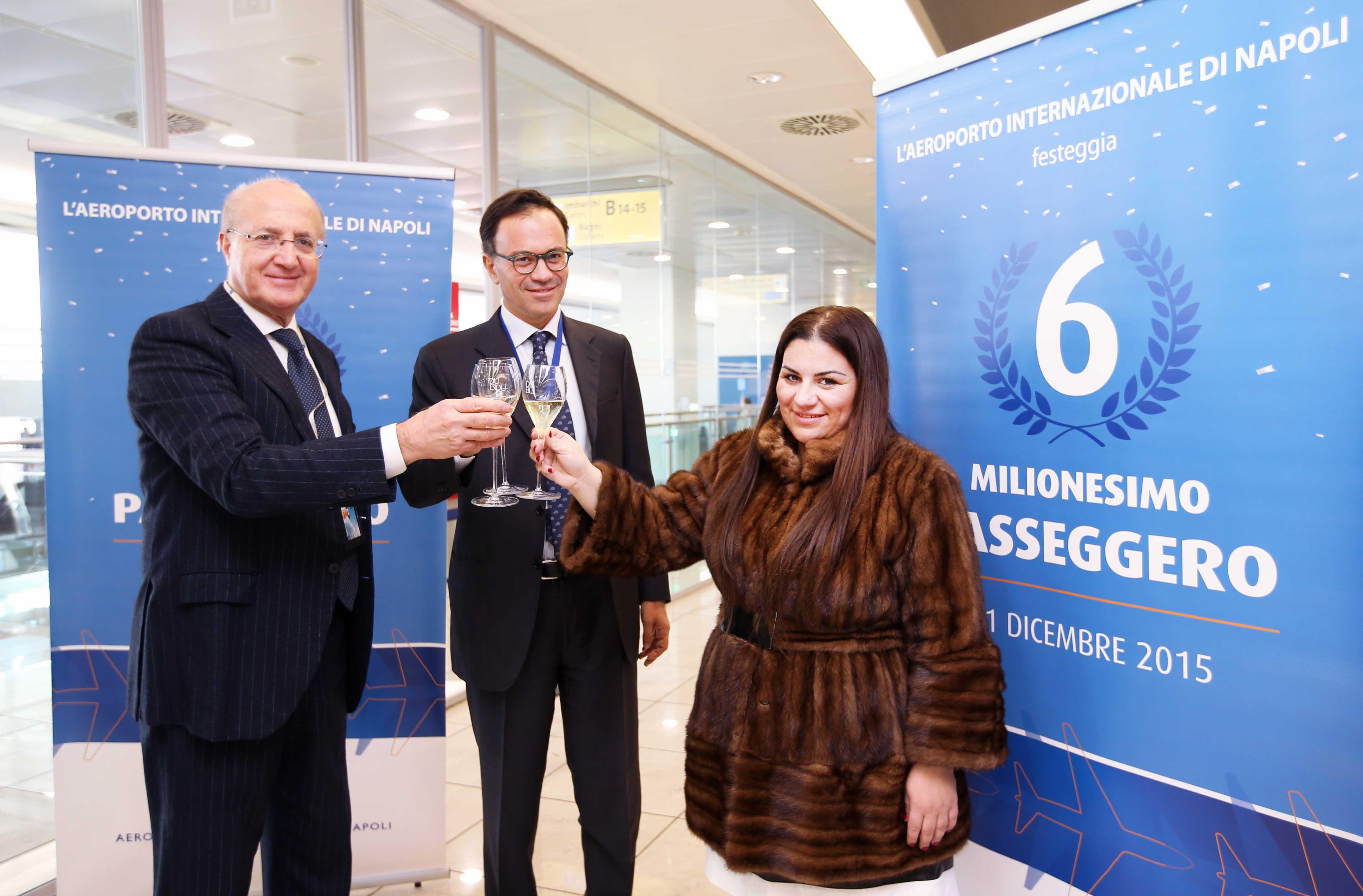 L’aeroporto di Napoli Capodichino festeggia il 6milionesimo passeggero. Ad essere premiata è stata la signora Concetta Matteo in partenza per New York con la figlia di cinque anni per trascorrere le festività con la famiglia. La donna è stato premiata dell’amministratore delegato Gesac – la società di gestione dello scalo di Napoli – Armando Brunini e dal direttore Enac Gennaro Bronzone, con un biglietto aereo omaggio per 2 persone e la Card “Fly You Privilege” con accesso illimitato al servizio fast track (imbarco veloce) e sala Vip, come riportato dal Corriere del Mezzogiorno.