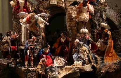 “Il presepe napoletano – raccontano gli Scuotto – è tra gli strumenti più efficaci per raccontare le contraddizioni di un’umanità alla continua ricerca di redenzione e il tortuoso viaggio che ogni anno si compie fino all’avvento della speranza, quindi di Cristo. La piena fiducia della committenza americana ci ha consentito di realizzare, con completezza, un’opera che rappresenta la realtà di oggi espressa con l’ineguagliabile stile settecentesco. Il Presepe della Misericordia raccoglie l’invito di Papa Francesco ad abbracciare il principio della misericordia verso i poveri e gli ultimi. Ogni personaggio racconta una sua piccola storia. La Natività si staglia in alto, al centro della scena ma appena sotto c’è il diavolo, in catene e annichilito dalla nascita del Bambino. Gli opposti si fronteggiano. Guappi che si sfidano al primo sangue, un barcone che accoglie piccoli migranti“.