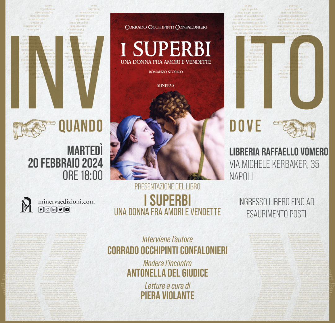 Martedì 20 febbraio, alle ore 18, presso la libreria Raffaello, in via Kerbaker 35, a Napoli, si terrà la presentazione del libro “I Superbi – Una donna fra amori e vendette” (Minerva Edizioni), di Corrado Occhipinti Confalonieri.