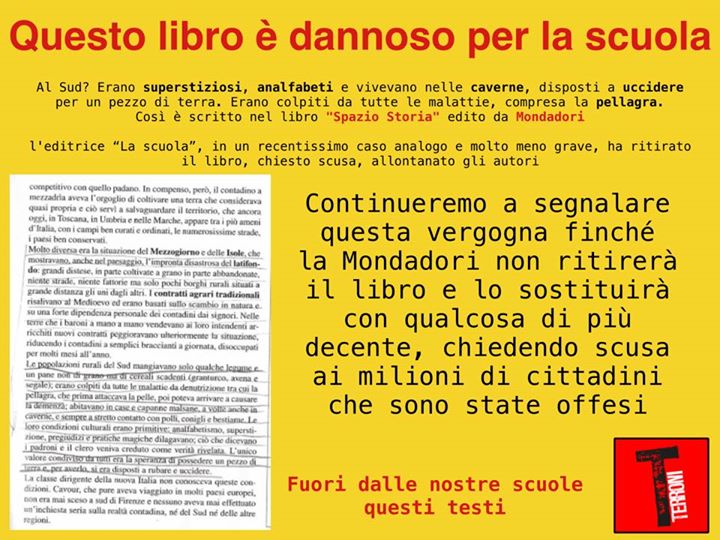 Arriva direttamente dalla pagina facebook Terroni di Pino Aprile, la denuncia per l’ennesimo caso di libri scolastici antimeridione. Un attacco contro una visione della Storia che proprio non vuol saperne di essere messa da parte. Di prendere parte, appunto, a quel revisionismo il cui processo tende a essere rallentato proprio da certi testi.