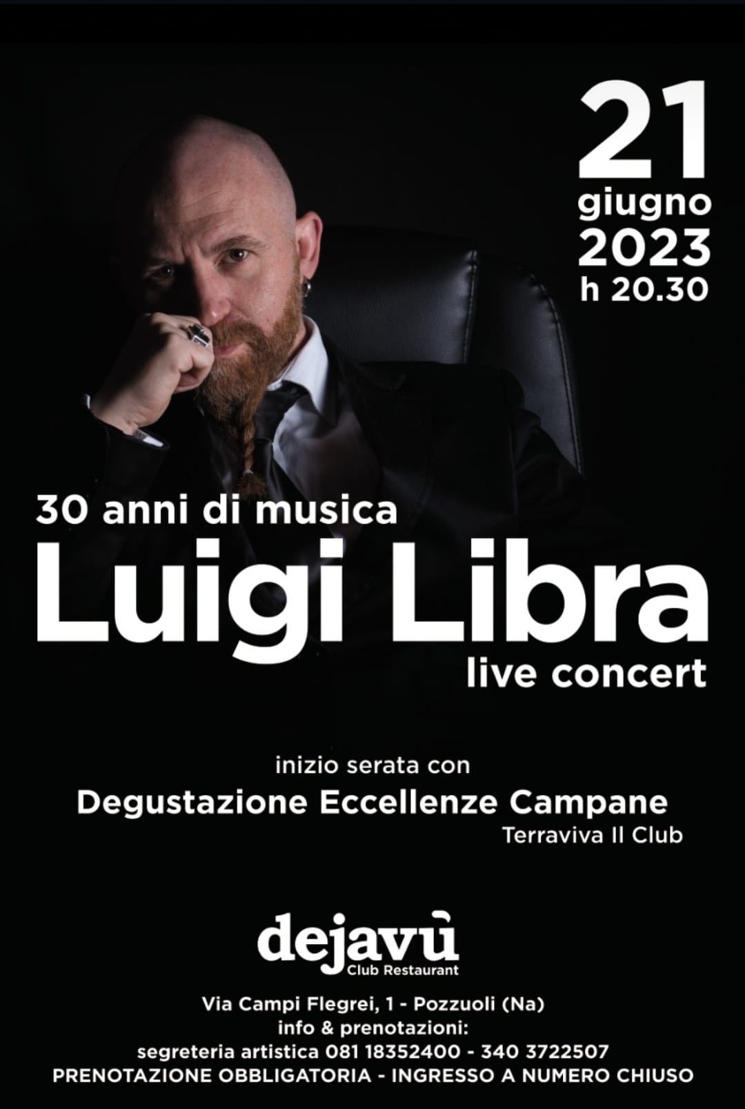 Il Dejavù di via Campi Flegrei 1 a Pozzuoli il 21 giugno sarà teatro del Luigi Libra live concert, il racconto di 30 anni di carriera dell’Ambasciatore della canzone napoletana tra pezzi inediti e interpretazioni di classici napoletani.