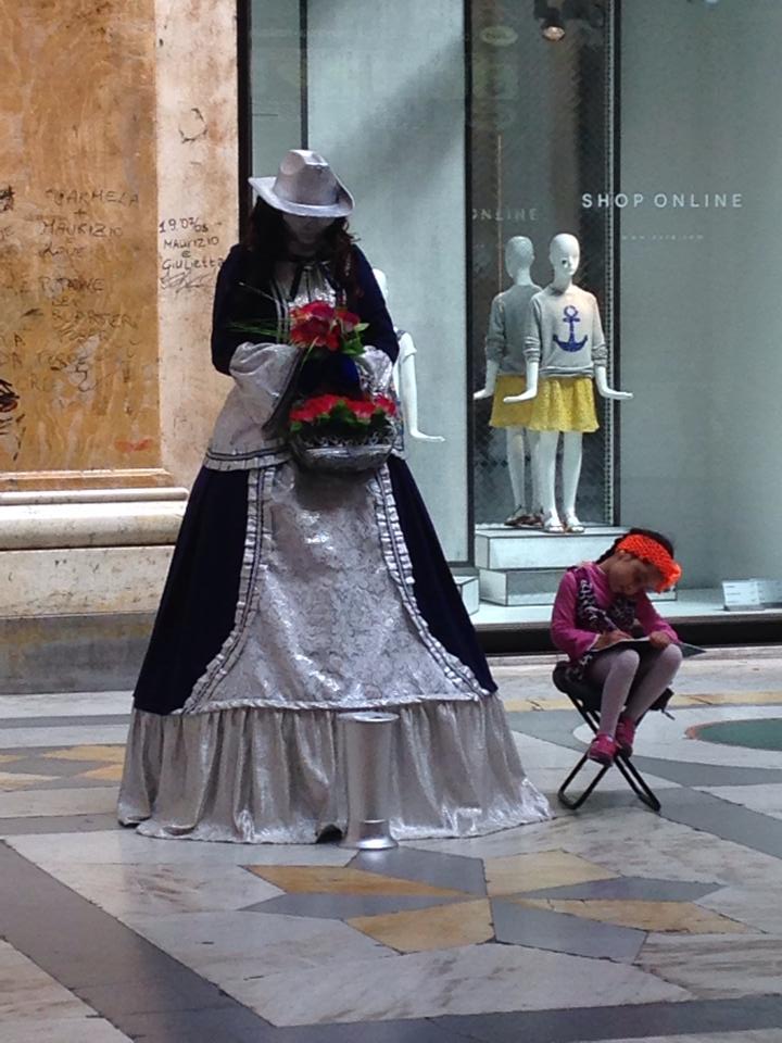 Proprio pochi minuti fa, si poteva vedere al centro della Galleria Umberto a Napoli una delle tante “statue” umane che posano per i turisti. Questa volta, però, la “mamma statua” era accompagnata dalla figlioletta che, costretta in una seggiolina, era intenta a svolgere i compiti di scuola. Una volta che l’artista di strada si è accorta di essere fotografata ha fatto spostare e nascondere la piccola per poi richiamarci chiedendo un pagamento per ogni foto scattata.