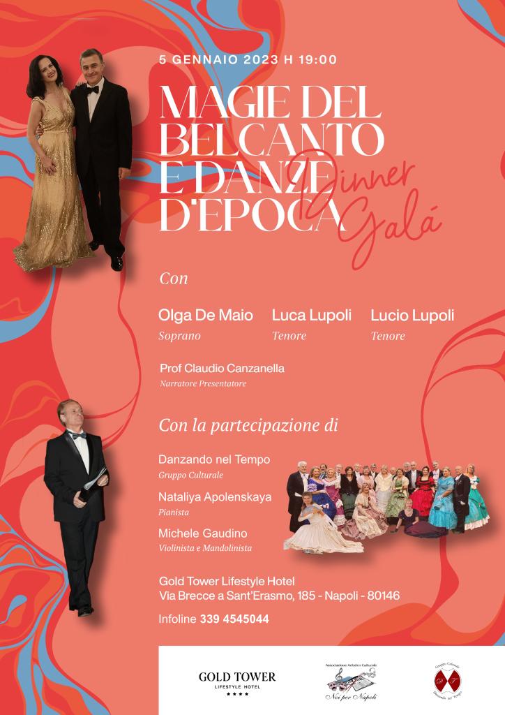 L’ Associazione Culturale Noi per Napoli, in collaborazione con il Gruppo Culturale ”Danzando nel Tempo” presenta un evento davvero esclusivo e particolare, in apertura del nuovo anno 2023, nella magnifica ed esclusiva cornice della Terrazza Attico Ramè del Gold Tower Lifestyle Hotel, un connubio tra Belcanto e Danze d’epoca.