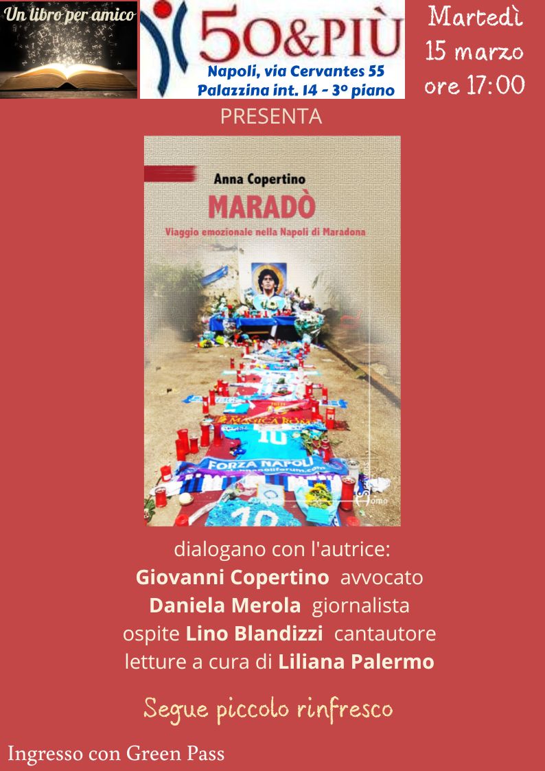 Martedì 15 marzo 2022 presso il patronato 50&Più, in Via Miguel Cervantes de Saavedra, 55, 80133 Napoli, si presenta “Maradò, Viaggio emozionale nella Napoli di Maradona” di Anna Copertino, edito da Homo Scrivens.