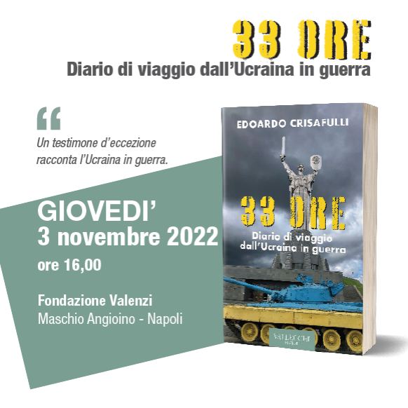 La presentazione del libro “33 ore. Diario di viaggio dall’Ucraina in guerra” di Edoardo Crisafulli, edito da Vallecchi è in programma Giovedì 3 Novembre dalle ore 16 al Maschio Angioino presso la Sala Litza Cittanova Valenzi nella sede della Fondazione Valenzi, l’istituzione internazionale dedicata a Maurizio Valenzi, parlamentare italiano ed europeo, sindaco a Napoli dal 1975 al 1983.