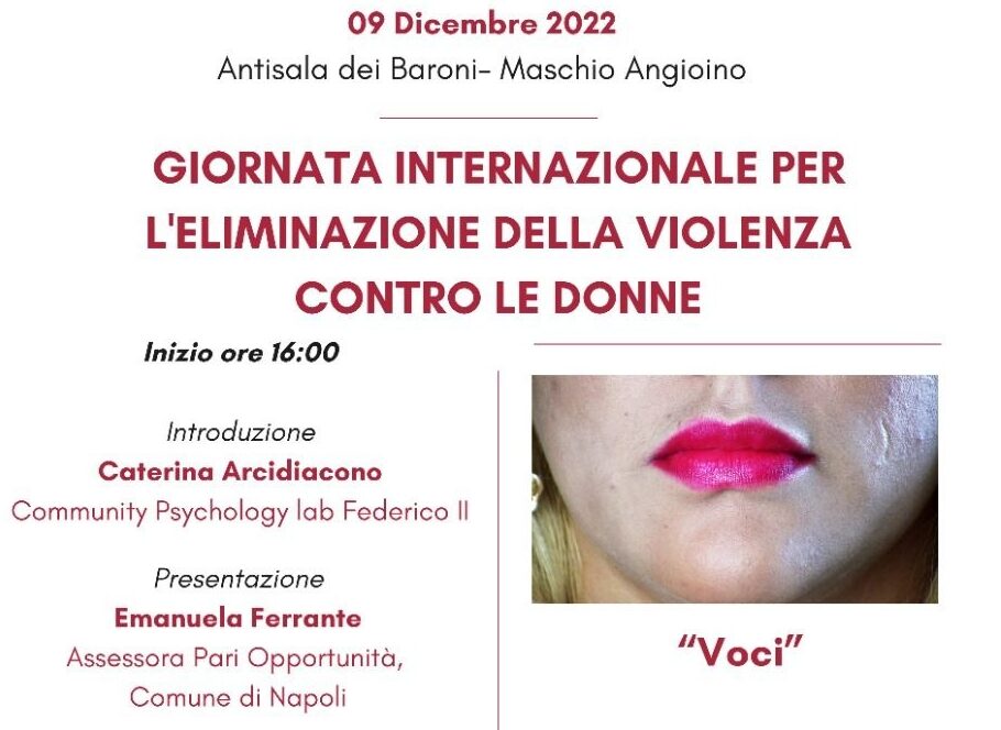 Il 9 dicembre 2022 dalle ore 09:00 alle ore 18:00 si terrà, presso l’Antisala dei Baroni del Maschio Angioino, la mostra delle installazioni video “Voci” per il contrasto alla violenza di genere a cura del dipartimento degli Studi Umanistici della Università Federico II in collaborazione con il progetto Fullbright.