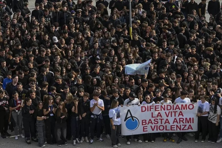 Dopo aver letto i testi i ragazzi hanno dedicato all’ amico il brano ‘L’ultima Poesia’ di Geolier e Ultimo e poi sono rientrati in classe. E su uno striscione esposto si legge: “Difendiamo la vita, basta armi e violenza”.
