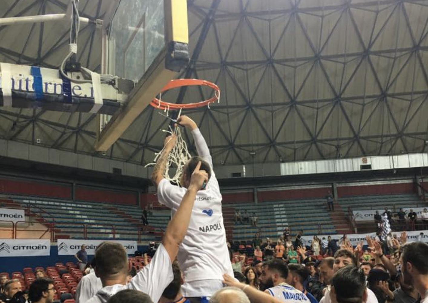 Il Cuore Napoli Basket trascinato da uno scatenato Visnjic (31+13) vola in Serie A2. A festeggiare con gli azzurri ben 400 tifosi arrivati da Napoli fino al Palaterme di Montecatini per vivere il sogno di tornare dopo anni in A2. una promozione che arriva dopo una stagione esaltante e dopo aver vinto in inverno la Coppa Italia di Serie B.