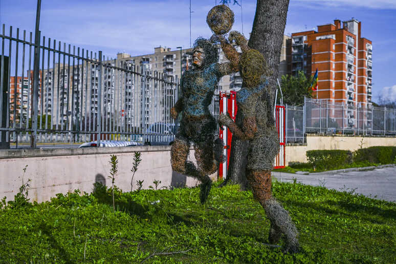 E’ispirata al famoso gol di mano di Diego Armando Maradona in Argentina-Inghilterra nei quarti di finale del Mondiale di calcio in Messico del 1986 l’opera installata a Scampia e realizzata completamente con filo metallico dall’artista Gerardo Rosato.