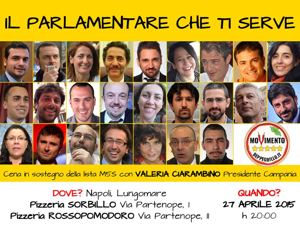 I parlamentari del Movimento 5 Stelle Campania camerieri per una sera per finanziare il partito. Il 27 aprile dalle 20, infatti, nella pizzeria Rossopomodoro e nella pizzeria Sorbillo, a servire le pizze ai clienti ci saranno: Luigi Di Maio, Alessandro Di Battista, Roberto Fico, Vito Crimi, Nicola Morra, Carlo Sibilia, Angelo Tofalo, Vega Colonnese, Carla Ruocco, Silvia Giordano, Matteo Mantero, Luigi Gallo, Vilma Moronese, Sergio Puglia, GIanluca Castaldi, Vito Petrocelli, Mimmo Pisano, Andrea Cioffi, Michele Dell’Orco.