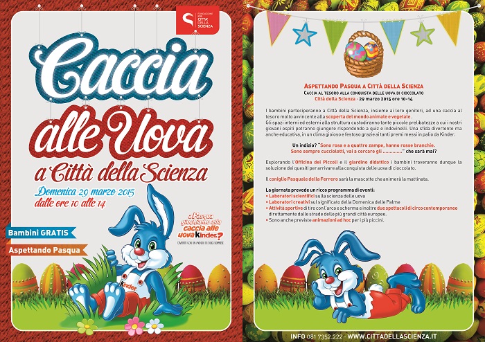 Domenica 29 marzo presso Città della Scienza di Napoli bambini e genitori insieme aspettando la Pasqua. L’appuntamento sarà alle ore dieci del mattino dove prenderà il via la grande caccia al tesoro, che metterà in palio tante piccole uova di cioccolato per tutti i vincitori. Le uova dovranno essere trovate risolvendo quiz, indovinelli indizi sul mondo animale e vegetale. Una caccia al tesoro divertente ed educativa, con la mascotte Coniglio Pasquale ad animare il tutto. I premi in palio saranno gentilmente offerti da Kinder Ferrero. Questa sarà la Pasqua a città della Scienza.
