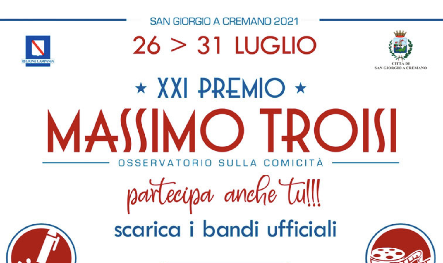 – “Miglior Attore Comico“, la domanda di partecipazione andrà presentata entro il 16 luglio 2021; dovrà essere recapitata a mano presso il Protocollo Generale del Comune di San Giorgio a Cremano o inviata tramite posta, indirizzata a: Comune di San Giorgio a Cremano Servizio Cultura Premio Massimo Troisi, P.zza Carlo di Borbone, 10 80046 San Giorgio a Cremano (Na), oppure mediante PEC all’indirizzo: protocollo.generale@cremano.telecompost.it