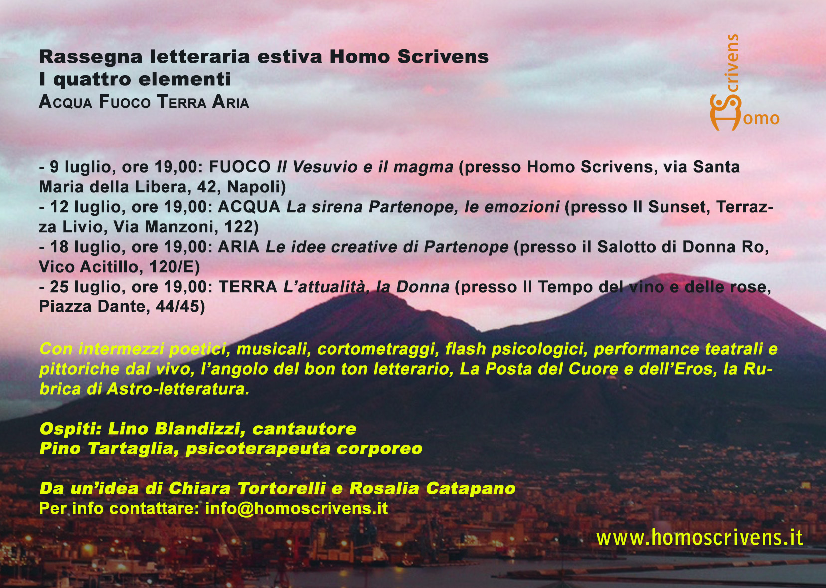 Quarto appuntamento, mercoledì 25 luglio alle 19:00, con la rassegna estiva di Homo Scrivens “Fuoco Acqua Aria Terra. I quattro elementi”, il format di Chiara Tortorelli e Rosalia Catapano. Location di questo ultimo incontro il Caffè Letterario “Il tempo del vino e delle rose” (piazza Dante 44/45 – Napoli). L’elemento che caratterizzerà la serata è: TERRA.