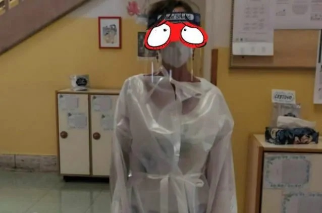 Camice di plastica e visiera davanti ai bambini: lo scatto diventa virale e impone qualche domanda