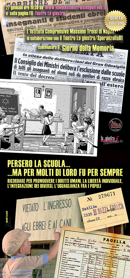 Mercoledì 27 gennaio 2021 alle ore 10.30, l’Istituto Comprensivo “Massimo Troisi” di Napoli, diretto dalla Prof. Dott. Elena Manto, e il Teatro La giostra di Napoli commemoreranno la “Giornata della Memoria 2021” con la quarta edizione di Ricordare per non ripetere, una giornata per condividere e far comprendere alle giovani generazioni, futuro del mondo nelle scuole e in famiglia e senza timore di raccontare o mostrare, la crudeltà dell’uomo obnubilato dal fascino del potere e dal denaro.