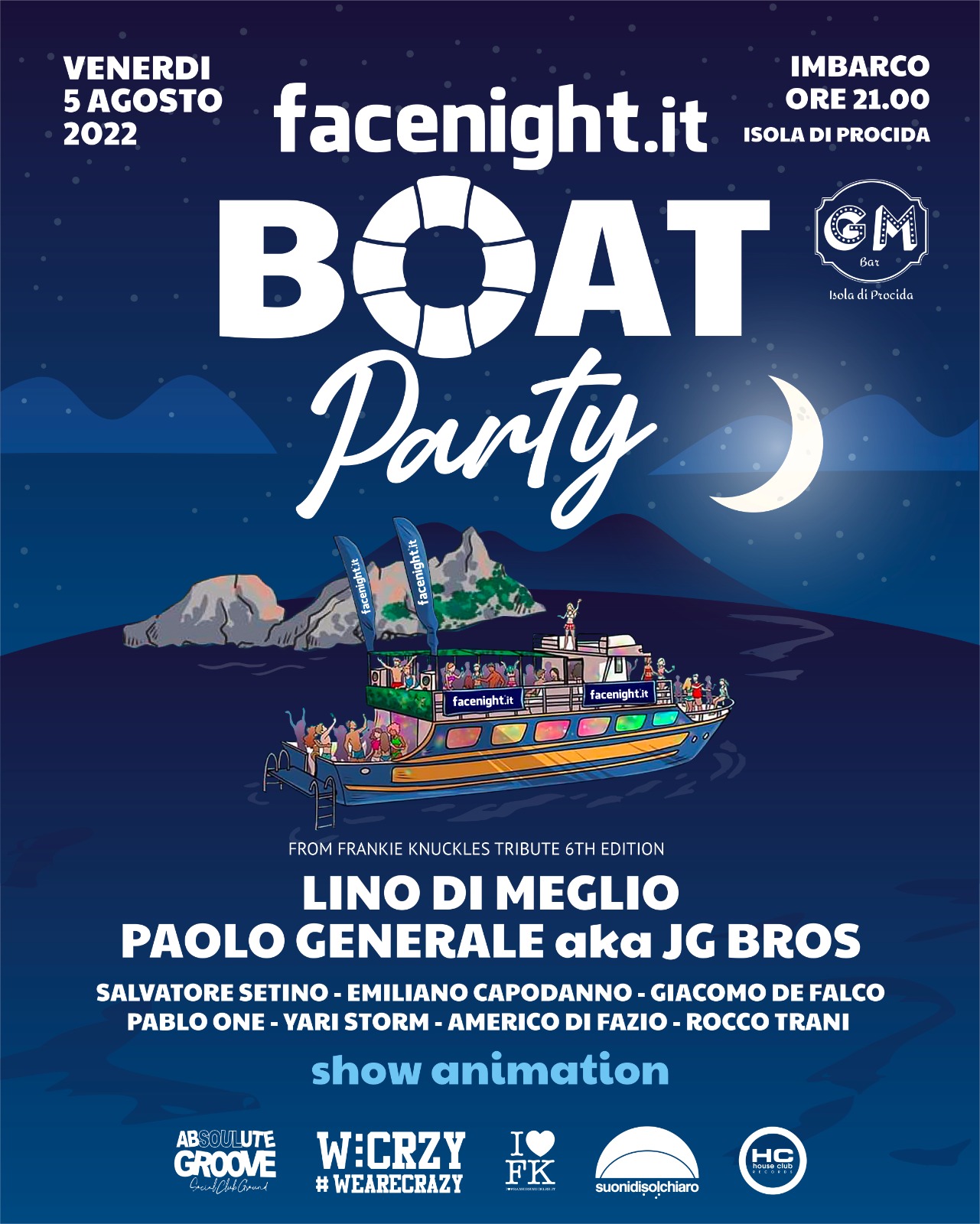 Tutti a bordo… si salpa! In attesa del gran galà 2022, che vedrà ancora una volta premiare in Autunno i più amati esponenti del night clubbing nostrano, i fautori degli Oscar della notte made in Campania hanno pensato di regalare un gustoso “assaggio” estivo ai propri habitué. Una full immersion, all’insegna di musica e tanto sano divertimento, che prenderà forma venerdì 5 agosto, a partire dalle 21. “Facenight Boat party”, questo il nome scelto per la magica one night al chiar di luna, organizzata in collaborazione con Gm Bar, vedrà in veste di co-protagonista, Procida.