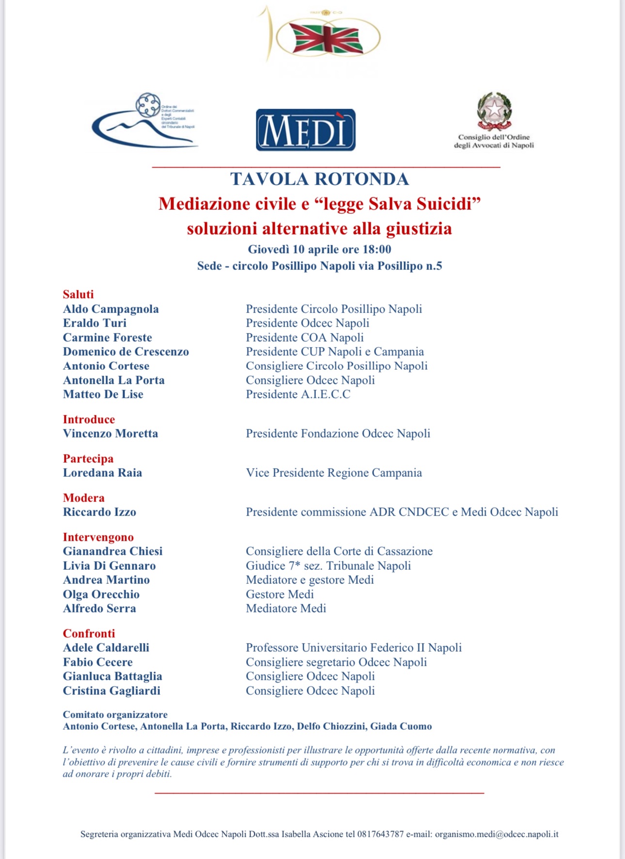 È con questo spirito che giovedì 10 aprile 2025, alle ore 18:00, presso il Circolo Posillipo di Napoli, si terrà la tavola rotonda “Mediazione civile e legge Salva Suicidi: soluzioni alternative alla giustizia”.